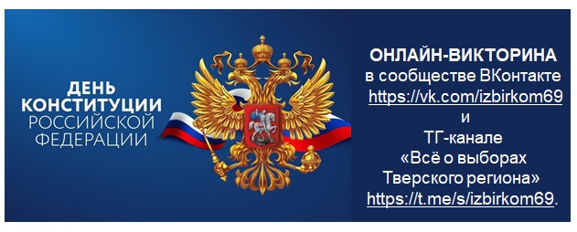 15 декабря с 15.00 до 16.00 избирательная комиссия Тверской области проводит онлайн-викторину, посвященную Дню Конституции Российской Федерации.