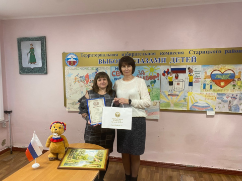 Председатель территориального избиркома Западнодвинского округа Елена Матвеева вручила ценные подарки и дипломы избирательной комиссии Тверской области учащимся Староторопской школы Ульяне Камчаткиной и Александре Цветковой. Школьницы стали призерами областного конкурса «Наш выбор — будущее России» в номинации «За лучший слоган, четверостишье, сочинение, очерк».